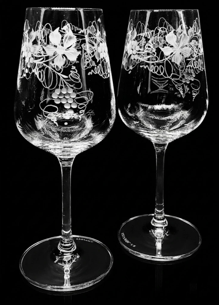 Čiré sklenice pro dva s rytým dekorem VÍNO, sklenice jsou české výroby.