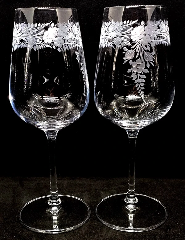 Čiré sklenice pro dva s rytým dekorem KOPRETINY II, sklenice jsou české výroby.