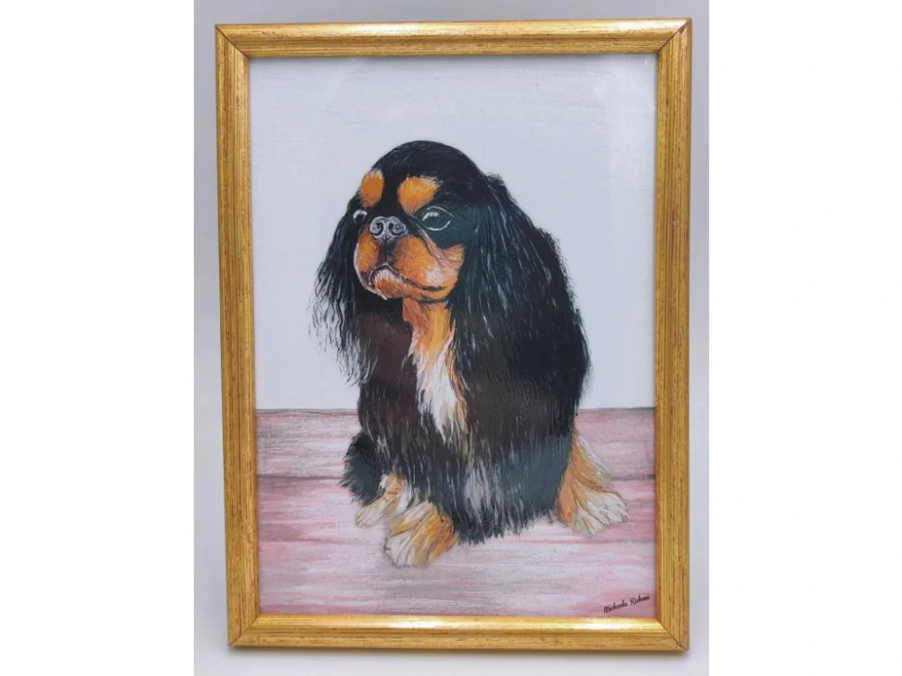 Portrét psa na skleněné desce vsazená do dřevěného rámu KING CHARLES